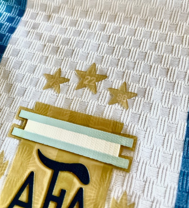Camisa de Argentina versión jugador, con logo de campeones del mundo 2022, sin número.